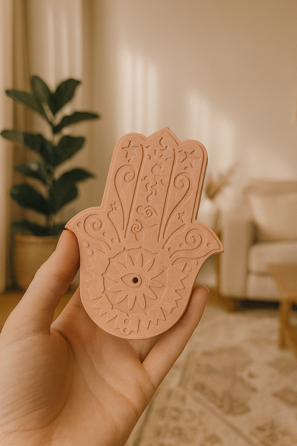Este elegante porta inciensos con forma de Mano de Fátima es una pieza única, elaborada a mano con resina orgánica y pigmentos vegetales, totalmente libre de tóxicos. Su diseño detallado, inspirado en símbolos de protección y energía positiva, lo convierte en un accesorio funcional y decorativo para cualquier espacio.