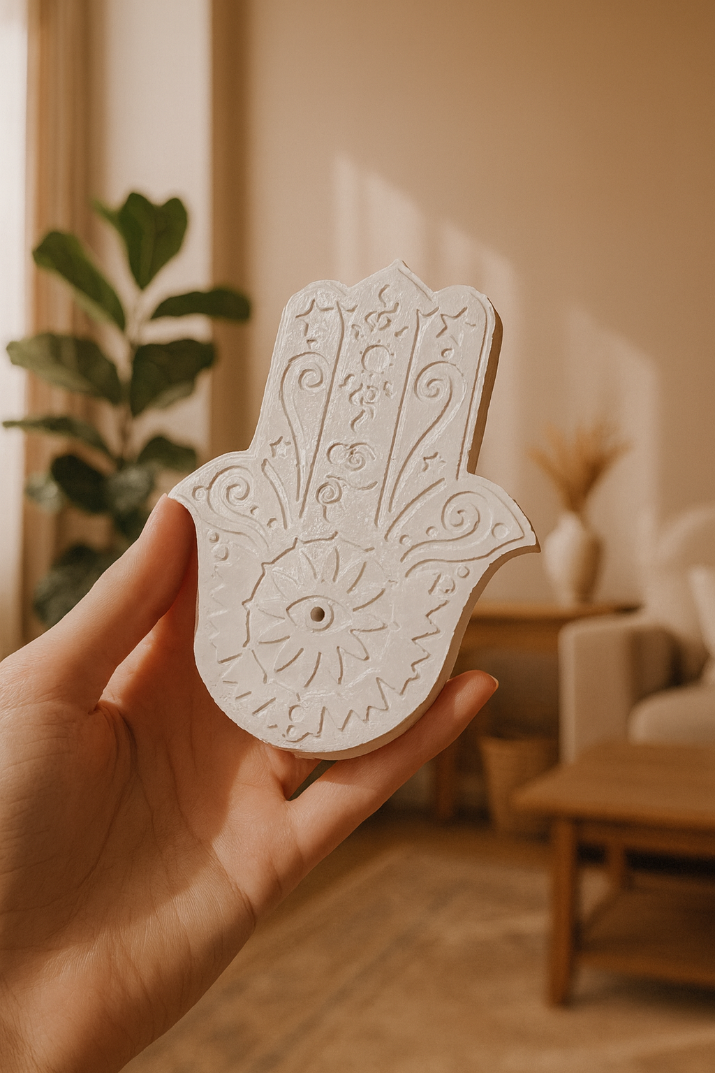 Este elegante porta inciensos con forma de Mano de Fátima es una pieza única, elaborada a mano con resina orgánica y pigmentos vegetales, totalmente libre de tóxicos. Su diseño detallado, inspirado en símbolos de protección y energía positiva, lo convierte en un accesorio funcional y decorativo para cualquier espacio.