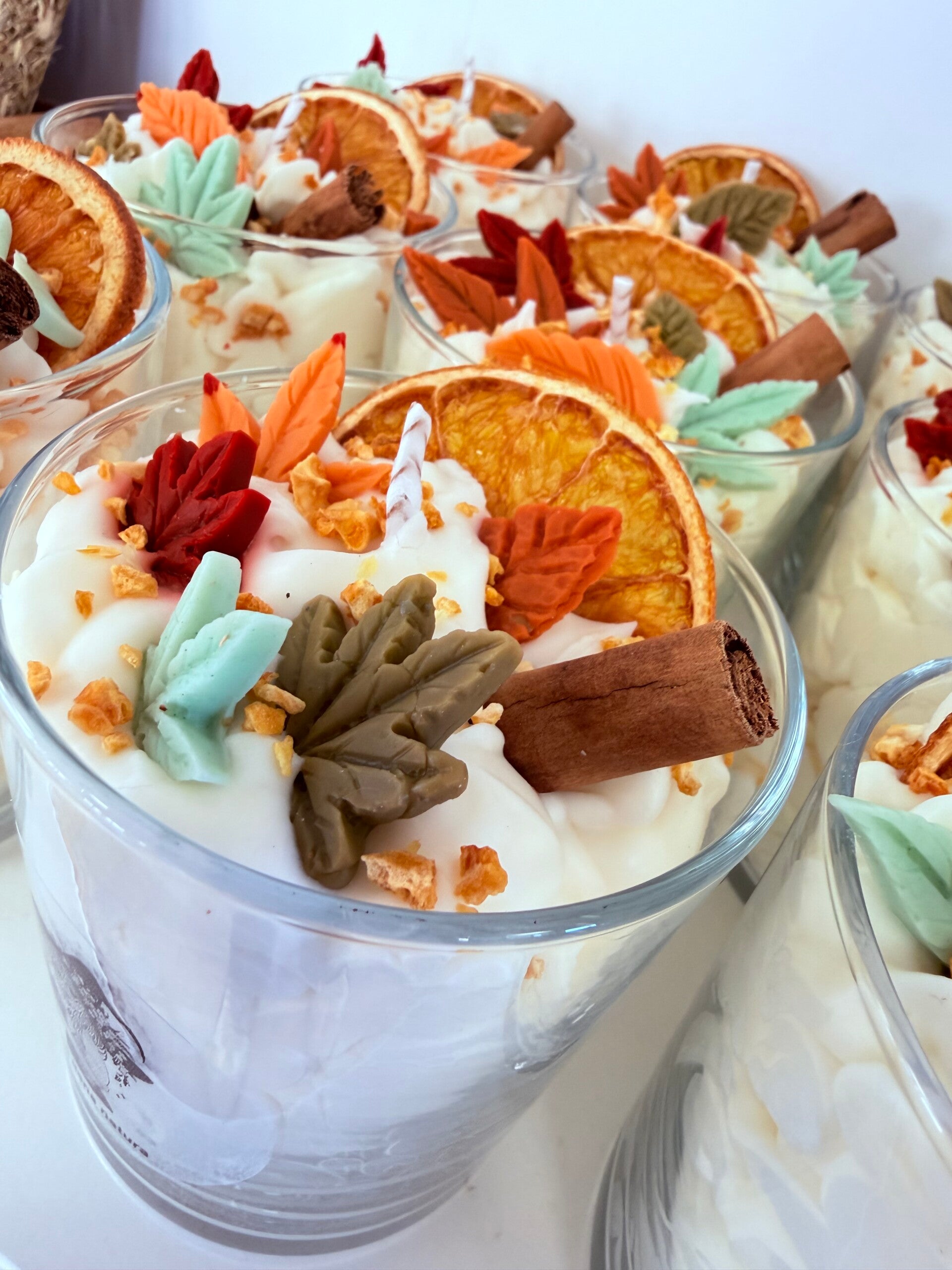 Cada vela está elaborada cuidadosamente a mano, decorada con detalles naturales como rodajas secas de naranja, ramas de canela y hojas de cera de colores, que reflejan la esencia de la temporada.